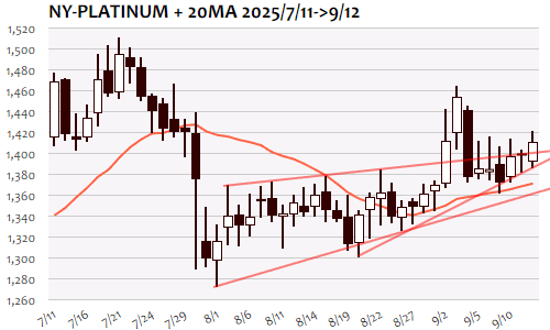 NYプラチナは+11.9ドル、0.85%高で3日続伸。9月3日(1455.1)以来、10日ぶりに1400ドルの大台を回復。アジア時間序盤の1380ドル台半ばが安値となってNY金の堅調推移に追随、1400ドルの大台ラインを挟んでの攻防を経て、ロンドン市場では1410ドル台へと上昇。NY市場でつけた高値では6営業日ぶりに1420ドル超え、ただしこれを維持できずに失速するとNY引け後には1400ドル付近へ。1370ドルから1460ドルまでの主要レンジ内で抵抗感が強まりつつあった1400ドル台へと水準を切り上げ、その先のレジスタンス候補1420ドルに到達して反落、次週は1400ドルの大台維持をかけた攻防から。