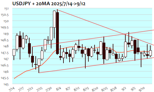 ドル円は+46銭、0.31%の反発で4日(148.45)以来、1週間ぶりの高値。東京朝には147円10銭台の安値からゆるやかに上昇、午後には147円半ばへと水準を切り上げ、欧州時間には高市トレードの勢いが強まって147円90銭台へと急騰。147円後半での保ち合いとなった欧州・NY時間には一時148円台へと上昇する場面も、失速後には上値を切り下げてNY午後には147円40銭台まで下落、NY終盤には147円60銭台へと下げ渋り。長期化する保ち合い下限を147円に切り上げ、148円50銭までのレンジ内推移で次週、FOMC待ちへ。下抜けると141円半ばを目指す流れへ、上抜けなら153円半ば辺りまでが上値目標に。