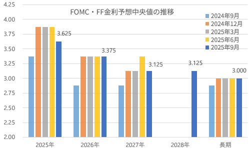 ドットチャートで示される2025年末のFF金利中央値予想は3.625%。レンジでは3.50-3.75%。即ちあと2回のFOMC、10月末と12月のFOMCでも0.25%×2回で合計0.50%のに利下げが有力に。