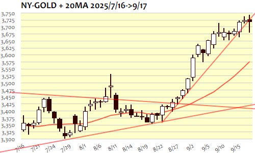 17日のNY金は-7.3ドル、0.20%安で4日ぶりの反落。3日連続で過去最高値を更新してきた急騰局面一服となって調整へ?時間外は3730ドル台から3700ドル近辺へと軟調推移、ロンドン・NY朝にかけて大台割れで下げ渋るとNY市場では3720ドル台へと反発。NY引け後にはほぼ予想どおり?のFOMC結果に乱高下の反応、3690ドル割れへと急落後には3740ドル台へと切り返して一時最高値を更新も、失速後にはパウエルFRB議長会見を受けての軟調推移で3680ドル近辺へ。これが安値となっての反発トライでは3700ドルの大台に抵抗感も。高値では短中期的な節目水準3750ドル近辺を試し、調整では浅めのサポート3670ドル手前で下げ渋る展開に。3670ドル割れなら3650ドル近辺へ、その下は3600ドルが当面のサポート。3700ドルの大台回復なら最高値圏再トライへも。
