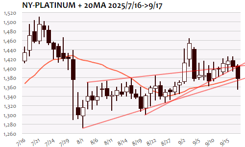 NYプラチナは-25.9ドル、1.85%の続落で9月9日(1372.1)以来、1週間ぶりの安値。時間外序盤の1410ドル手前が高値となって調整局面継続、ロンドン序盤に1400ドルを割れると1360ドル付近まで急落。NY市場では1380ドル近辺へと下げ渋りもNY引け後にはFOMCを経て一時1350ドル台半ばへと安値をつけ、1370ドル付近へと反発。節目の1370ドル維持をかけた攻防が目先のポイントに、これを維持できなければ軟調局面継続で1300ドル付近を目指す流れとなる可能性も。維持できれば1420ドルまでのレンジで保ち合い継続。