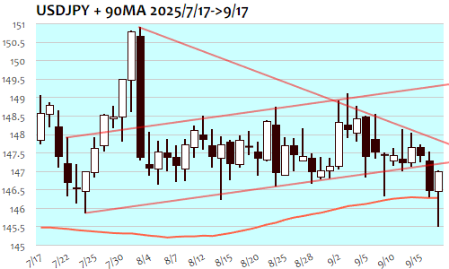 ドル円は+56銭、0.38%高で3日ぶりの反発。FOMCへの警戒感から146円半ばを中心に保ち合い推移で東京・欧州時間を通過、欧州・NY午前には上限を146円40銭台へと切り下げながら、下値は90日移動平均線(146.29)にもサポートされる形に。FOMCでの年内追加2回の利下げ見通しを受けて売り圧力が強まると一時146円も割れて145円40銭台まで急落。7月7日(144.22)以来、2ヵ月ぶりの安値をつけて切り返すとパウエル議長会見での「リスク管理の利下げ」などタカ派的な発言も好感する形で巻き戻しの流れが加速、146円後半へと急騰後には147円回復トライへ。前日のフライングで147円の節目割れに伴う下値目安141円半ば辺りまでを目指す流れは90日線にもサポートされる形となって巻き戻し、146円40銭が目先の下限となり、147円70銭まで、レンジを下方シフトしての保ち合い再開の様相に。