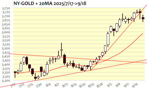 18日のNY金は-39.5ドル、1.06%の大幅続落で9月11日(3673.6)以来、1週間ぶりの安値。前日NY引け後のFOMCを経て急落後、自律反発局面となったこの日の時間外には3700ドルを回復して失速、戻り売りの形となって前日安値を下回る3670ドル近辺へと下落。ロンドン・NY朝にかけての反発局面では3700ドルの大台を再び回復、しかし米経済指標の好結果をきっかけにドル高急伸となった流れで3660ドル付近まで急落。この日の安値をつけた後、NY午後には3670ドル台へと下げ渋り。3730ドルを当面の上限に、3600ドルまでのレンジで高値保ち合いの様相となり、浅めのサポート3670ドルでいったん下げ渋り、これを割れると3650ドル前後までの下値切り下げへ。3730ドル超へと切り返すようなら次の最高値更新目標は3770ドル近辺。