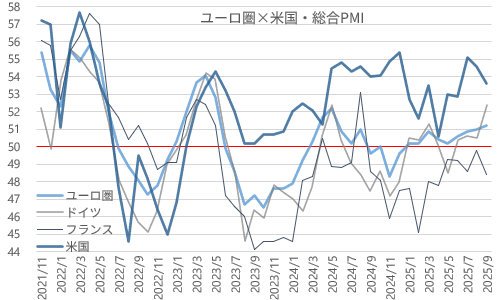 この結果、総合PMIはユーロ圏が51.2となり、小幅ながら4ヵ月続伸、9ヵ月連続節目50超維持で16ヵ月ぶり高水準。ドイツが52.4へと急騰して16カ月ぶり高水準、フランスは48.4へと反落で13ヵ月連続50割れ。