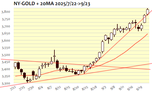 23日のNY金は+40.6ドル、1.08%の大幅高で3日続伸。2日連続、今年37回めの最高値更新。3730ドルの節目突破に伴う短期上値目標3770ドル近辺到達後の一服感もほどほどに、一段高トライへ。アジア時間の3770ドル台前半がこの日の安値となり、3780ドル近辺での保ち合い推移から散発的な上値トライ、ロンドン序盤に史上初の3800ドルの大台を突破するとそのまま3820ドル台半ばまで上昇。最高値更新後の一服感からNY市場にかけて3810ドル割れ、NY引け後には3800ドルの大台割れへ。短期調整目安、かつサポート候補としては堅調推移の9日移動平均線(3721.9)近辺から3700ドルの大台近辺まで。
