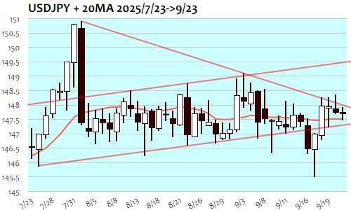 ドル円は-6銭、0.04%の小幅安で3日続落。9月17日(147.01)以来、1週間ぶりの安値。祝日で休場の東京時間は147円60銭台から80銭台までのレンジで小幅保ち合い推移、欧州時間には147円50銭近辺まで下値を切り下げ、NY市場では147円90銭台まで上値を切り上げ、NY午後には147円40銭台まで下落する場面も、ほぼ方向感なく横ばい推移。この日の変動値幅は47銭程にとどまり、今年の平均143銭の3分の1で今年2番めの小動き。引き続き146円半ばから148円までのレンジで保ち合い継続、上抜けなら149円程度までの上値切り上げも。
