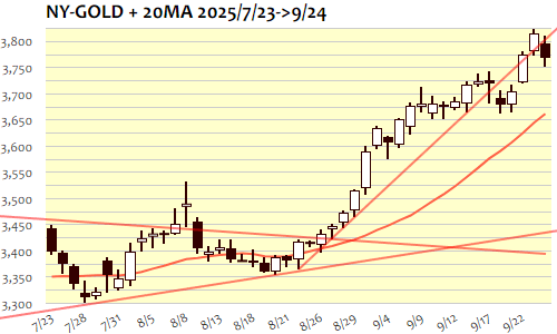 24日のNY金は-47.6ドル、1.25%の大幅安で4日ぶりの反落。3日ぶりの最高値更新ストップで調整へ。アジア時間には3800ドルの大台維持をかけた攻防から3780ドル付近まで下落して切り返し、ロンドン序盤にかけての反発で3810ドル台の高値をつけて失速。ドイツの9月IFO景況感指数が予想よりも悪化したことをきっかけにユーロドルが急落した流れに追随、3800ドルの大台割れではいったん下げ渋るもNY朝には米長期金利上昇とドル高基調に押される形で一段安、NY午後には3770ドル割れ。NY引け後には一時3750ドル割れの安値をつけて3760ドル台へと切り返し。この日の安値圏3750ドルが目先のサポートとなれば3820ドルまでのレンジで高値保ち合い形成へ。調整継続なら3700ドルの大台から3670ドルが次のサポート候補、3820ドル超へと反発なら次の最高値更新目安は3860ドル近辺。