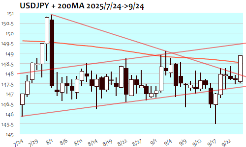 ドル円は+124銭、0.84%高で4日ぶりの反発。7月31日(150.80)以来、ほぼ2ヵ月ぶりの高値。東京朝の147円50銭台が安値となって堅調推移、午後には148円トライ、東京市場終了時に大台を突破すると欧州時間には一段高。ドイツIFO景況感指数の悪化を受けてユーロ安ドル高進行の流れに連れ高となって148円30銭近辺へと水準を切り上げ、NY朝にかけても米10年債利回り上昇とドル高の流れが続いて148円70銭台へ、NY午後には148円90銭台まで上昇。146円半ばから148円までの保ち合いレンジを上抜け、短期上値目標149円程度に急接近。短期的には多少の上昇余地を残しながらも一服となって週末のPCE確認へ。200日移動平均線(148.54)にサポートされるようなら短中期的な流れに変化も。