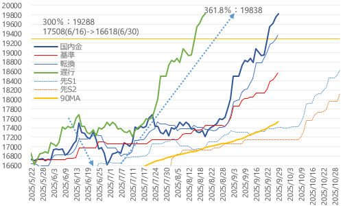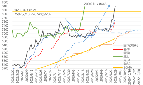 一目均衡表では基準線(7635)を上回る転換線(7746)を9月半ばに上抜けて急加速。三役好転の強気相場は加速中。7月高値(7597)から8月安値(6748)の200%戻し(8446)付近に到達し、次に意識される節目としては261.8%戻し(8971)から9000円の大台も。