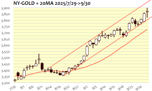 30日のNY金は+18.0ドル、0.47%高で4日続伸。2日連続、今年39回めの過去最高値更新。アジア時間に前日高値を超え、3860ドル台から3890ドル台へと一段高。最高値では3900ドルの大台にわずかに届かず失速するとロンドン序盤にかけて調整売り、3820ドル付近まで急落するとロンドン・NY市場にかけて下げ渋って押し目買い。NY市場では9月のシカゴPMIや消費者信頼感指数などが低調となったことを受けて3850ドル近辺から3880ドル台へと急騰、いったん失速後もNY引け後には3880ドル台へと再上昇。引き続き米政府機関の一部閉鎖リスクもサポート材料に。3900ドルの大台が目先のレジスタンスとなればいったん調整へも。3760ドルが当面の下値サポート、3800ドルの大台もサポート候補に。