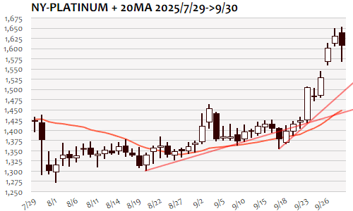 NYプラチナは-26.6ドル、1.63%安で4日ぶりの反落。アジア時間には一段高トライ、前日高値を超えて1650ドル台半ばまで上昇。2013年2月20日(1699.0)以来、12年7ヵ月ぶり高値をつけて失速するとロンドン序盤にかけて調整局面急加速、一時1570ドル割れの安値をつけて切り返すとNY市場では1620ドルまで反発。NY午後には失速も1600ドルの大台を維持し、NY引け後には1610ドル台へ。一定の調整も下ヒゲを残して下げ渋り、高値保ち合いの様相にも。1600ドルの大台維持が目先のポイントに、1640ドル超へと上値トライ再開なら1680ドル程度までが短期上値目標に。