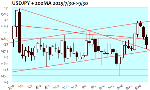 ドル円は-65銭、0.44%安で3日続落。東京朝には148円60銭台から80銭台まで小幅に反発して失速、戻り売りの展開となって午後には148円前半へ。日銀の早期利上げ再開懸念や米政府機関の一部閉鎖が確実視される状況も売り圧力となり、欧州時間には147円80銭台まで下落。いったん下げ渋っての反発も148円ラインに抵抗感も、NY市場では米シカゴPMIや消費者信頼感指数の悪化を受けて147円60銭台まで下落。ただし147円半ばの節目ではサポートされる格好にもなり、NY終盤には147円90銭台まで反発。目先、147円半ばの節目を維持できなくなれば146円付近までを目安に下値切り下げも。