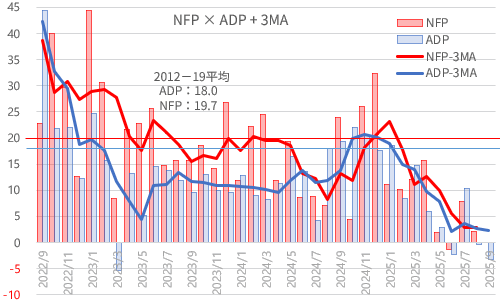 雇用統計NFPとADPの3ヵ月移動平均での24ヵ月相関係数は、2024年4月の0.92台から急低下で2025年5月には-0.068へ、その後は急回復で8月時点では0.61台。
