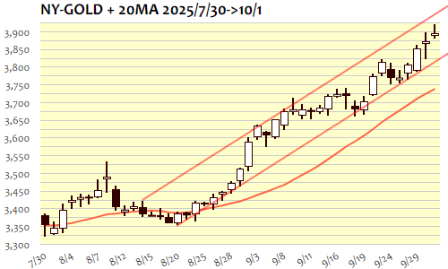 1日のNY金は+24.3ドル、0.63%高で5日続伸。3日連続、今年40回めの過去最高値更新。アジア時間には3890ドル近辺での保ち合いから一時3900ドルの大台超え、これは維持できなかったものの、3880ドルの安値をつけて切り返すとロンドン序盤に大台再トライ、最高値を3920ドル台まで切り上げて一服後はNY市場にかけてゆっくりと巻き戻し。ADP雇用の下振れを受けたドル安局面では反発も一時的となり、NY午後には3900ドル割れ、NY引け後には3890ドル近辺へ。大台到達後に上ヒゲを残しての失速で一服感も。週末の雇用統計も発表延期となれば、多少の調整タイミングにも。3800ドルの大台から3760ドルの節目までが当面のサポート候補。