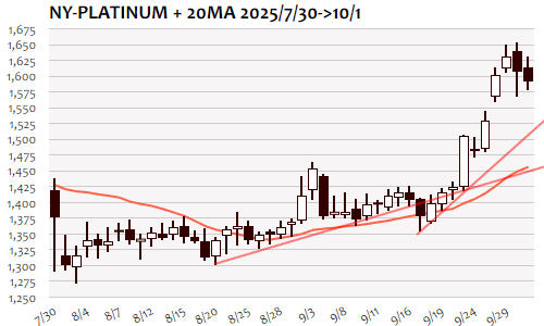NYプラチナは-15.0ドル、0.93%の続落で9月25日(1530.0)以来、1週間ぶりの安値。アジア時間に1630ドル台へと反発して失速、1600ドルの大台割れではいったん下げ渋り、ロンドン序盤には1620ドル台へと再反発も1630ドルに届かず、戻り売りの展開に。NY市場で1600ドルの大台を割れると安値では1570ドル台半ばまで下落。前日安値こそ下回らなかったものの、自律反発も1590ドル台まで。それでも9月安値(1354.0)から9月高値(1655.0)までの23.6%戻し(1584.0)を達成して下げ渋る格好にも。下げ止まって1640ドル超へと切り返す展開となった場合には1680ドル近辺までが短期上値目標に。調整継続なら38.2%戻し(1540.0)近辺が目安に。