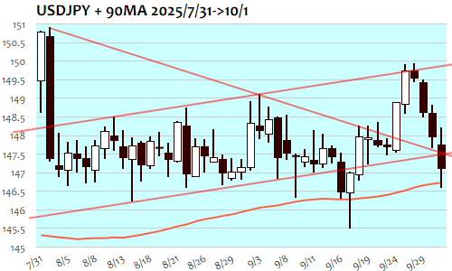 ドル円は-86銭、0.58%安で4日続落。9月17日(147.01)以来、2週間ぶりの安値。東京朝には147円80銭近辺から148円20銭台まで小反発後に戻り売り、148円割れではいったん下げ渋るも午後には147円半ばから前半へ。米政府機関の一部閉鎖受けての軟調推移で欧州時間には147円割れの攻防、NY朝にはADP雇用が予想外に落ち込んだことを受けて146円半ばまで急落。その後ISM製造業景況指数が予想をわずかに上回ったことを受けて147円回復トライへ。結果的に147円半ばの節目割れに伴う一段安トライが進行、短期下値目安146円付近まで、若干の下げ余地も残す状況に。なお、146円も割り込むようなら短中期的なトレンドが崩れて下方向への圧力が一段と強まる可能性も。