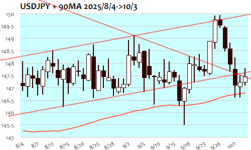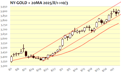 3日のNY金は+40.8ドル、1.05%の反発で2日ぶり、今年41回めの最高値更新。アジア時間に3860ドル付近まで下押し後に反発、ドル安局面に連れて3880ドル台へと戻すとNY朝には3900ドルの大台再トライ。米9月サービス業PMI改定値が予想を上回ったのに対し、ISM非製造業景況指数が予想を下回る低調となったことで上下動の反応も、下値を切り上げる展開となって高値では3910ドル台半ばまで上昇。前日の最高値には少し届かなかったもののNY引け後も3910ドル台を維持。3900ドルの節目を上抜けたことで一段高トライへと向かう可能性、短期上値目標は3950ドル近辺まで。下値サポートを3860ドルへと切り上げ、これを割り込むようなら3800ドル近辺までを目安に調整へ。