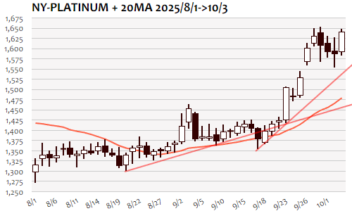 20年代前半の保合いを上抜けたプラチナは20年代後半高値圏? 10/3(金)