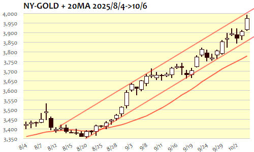 6日のNY金は先週末から+67.4ドル、1.72%の続伸で2日連続、今年42回めの最高値更新。週明け時間外スタート時点の3910ドル付近が安値となって堅調推移、アジア時間に3950ドル台へと水準を切り上げてロンドン市場では3970ドルトライ。米政府機関一部閉鎖の長期化懸念などから買い圧力は衰えず、NY市場でも3950ドル近辺までの下押し後には3980ドル台へと押し目買い、高値では3990ドル台半ばまで上昇し、NY引け後も3980ドル台で高止まり。3900ドルの節目突破に伴う短期上値目標3950ドル近辺に到達し、これがサポートとなる形で一段高。4000ドルの大台トライも時間の問題か、あるいは意外とこれがレジスタンスに?