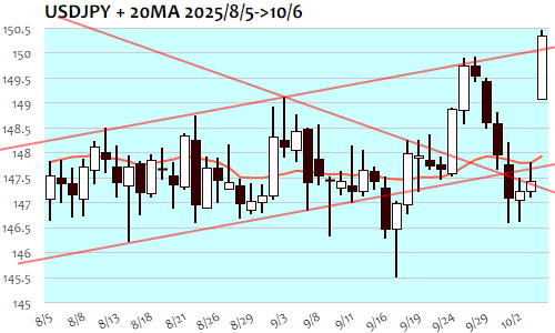 ドル円は+291銭、1.97%の大幅高で3日続伸。7月31日(150.80)以来、2ヵ月ぶりの高値。週末の自民党総裁選の結果を受けて高市新総裁への期待から株高・円安基調が急加速。週末の147円40銭台から週明けは149円台へと水準を切り上げ、窓開けスタート。午後には150円の大台回復トライ、高値では150円40銭台まで上昇し、欧州時間もこの水準を維持。NY朝には高市新総裁のブレーン、本田元内閣参与の「150円を超えたら、やや行き過ぎ」や日銀の年内利上げ肯定発言を受けて149円70銭台まで急落も、徐々に買い戻されてNY終盤には150円30銭台を回復。149円80銭の節目を上抜け、保ち合い上方ブレイクの形となってもう一段の上値トライへと向かいやすい状況に、短期上値目標は151円台へ。