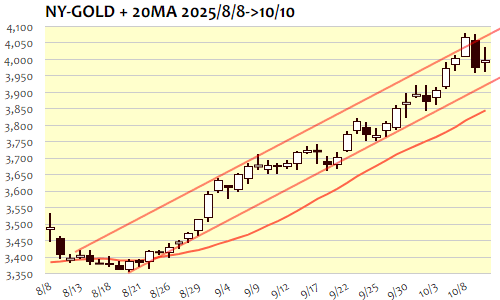 10日のNY金は+27.8ドル、0.70%の反発。前日の大幅安からの自律反発で4000ドルの大台回復トライとなった時間外、4010ドルまで反発後に失速すると3960ドル付近まで反落。前日安値手前で下げ渋るとロンドン・NY市場にかけて再び大台回復トライ、NY市場ではトランプ大統領が中国のレアアース輸出規制を巡って中国を批判、これを受けてのドル安急伸に連れ、4040ドル手前まで急騰。いったんは失速もドル安の戻りが限定的となり、4000ドルの大台がサポートに切り替わる格好にも。NY引け後にはトランプ大統領の対中国100%の追加関税発言で4030ドル台へと再反発。習近平中国国家主席との会談中止も示唆され、平穏だった米中関係に再び波風が立ち始め、調整局面継続の可能性もあったNY金は下げ渋り。3970ドルが目先の下値サポートとなって高値保ち合いの様相にも。これを維持できない場合には、3900ドル近辺までを目安に調整再開へ。反発局面継続で4080ドル超へと抜け出すようなら4120ドル近辺までを目安に一段高トライへ。