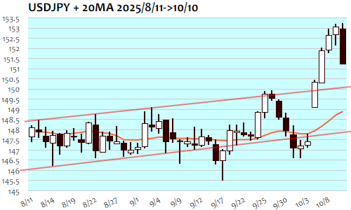 ドル円は-190銭、1.24%安となって7日ぶりの反落。週初、10月6日(150.37)以来の安値へと巻き戻し。東京朝には153円20銭台まで上昇、前日高値をわずかに上回り、2月13日(154.67)以来8カ月ぶり高値をつけて失速。午後には153円割れへと水準を切り下げ、公明党の連立政権からの離脱も下押し圧力となり、一時152円30銭台まで急落。戻りも限定的となって欧州・NY朝にかけても152円半ばで軟調気味に。NY市場ではトランプ大統領の中国批判発言から米中対立激化懸念再燃となり、151円半ばへと急落。波乱の国内政局と米中対立再燃により、行き過ぎたドル高円安の流れが巻き戻された格好にも。153円10銭が当面の上限となり、9月安値(145.49)から10月高値(153.27)の23.6%戻し(151.43)を達成した現状、一段安へと向かえば38.2%戻し(150.30)、半値戻し(149.38)辺りまでが意識される可能性。