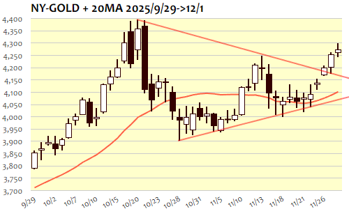 1日のNY金は先週末から+19.9ドル、0.47%高で6日続伸。最高値の10月20日(4359.4)以来、6週間ぶり高値圏で一段高。6日続伸は9月以来、3ヵ月ぶりで今年3度め。時間外スタート時点で4240ドル付近までの下押し後に4290ドルまで反発、その後4250ドルまで反落も、にロンドン・NY朝にかけてはドル安局面に連れて4290ドル近辺再トライ。高値では4300ドル付近まで上昇も、大台手前で上値を抑えられ続けて失速、NY午後には4270ドル近辺での保ち合いに。4350ドル台の最高値圏再トライの前に、4300ドルの大台ラインが目先の攻防ラインに。
