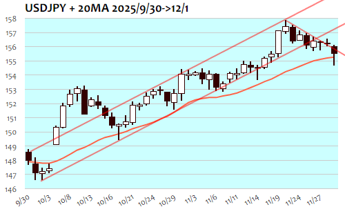 ドル円は-66銭、0.42%安で3日続落。11月17日(155.24)以来、2週間ぶりの安値。植田日銀総裁の利上げ示唆ともとれる発言を受けて東京市場では軟調推移、156円を割れて155円半ばまで下落して午後には下げ渋り。しかし欧州時間には戻り売りとなって軟調局面再開、NY朝には154円60銭台まで下落。しかしNY市場では米10年債利回り上昇局面に連れる形で反発するとNY午後には155円半ばを回復。利下げ織り込み済の状況を示唆するかのように、米11月ISM製造業景況指数の低調な結果はほぼスルー。156円の節目割れに伴う短期下値目安155円近辺にも到達し、少しのオーバーランから巻き戻し。155円近辺再トライ余地も残しながら156円半ばまでが目先の主要レンジに。