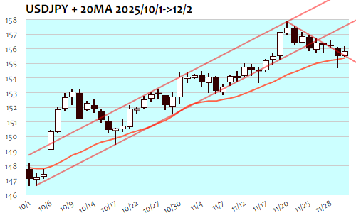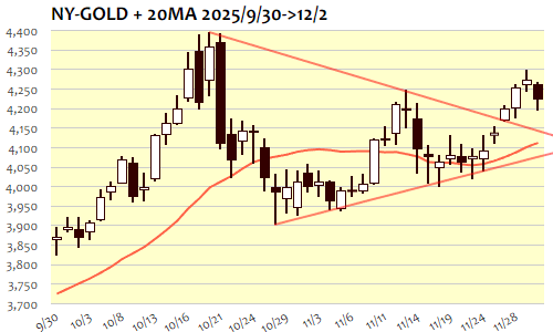 2日のNY金は-54.0ドル、1.26%安で7日ぶりの反落。時間外スタート時点の4270ドル付近が高値となって調整へ、ロンドン序盤には4210ドルまで下げて一度は反発。しかしNY朝の4260ドル近辺で頭打ちとなって戻り売り、ドルの反発局面にも押される形となって一時4200ドル割れへと急反落も、ドル高の巻き戻しに連れてNY午後には4220ドル台へと反発。NY引け後には4240ドル台へ。10月以降の絶対値平均騰落値幅53.1ドル(1.29%)と同程度、最近の平均的な調整にとどまり、下ヒゲも残して下げ渋る格好にも。目先の上限4280ドル超へと切り返すようなら4300ドルの大台再トライへ、短期上値目標は4320ドル近辺まで。