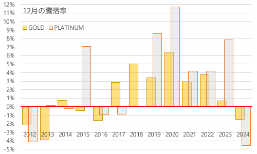 なお、NYプラチナもNY金に追随する形で2018年から2023年まで6年連続で上昇。しかし2024年の12月は7年ぶりに下落。
