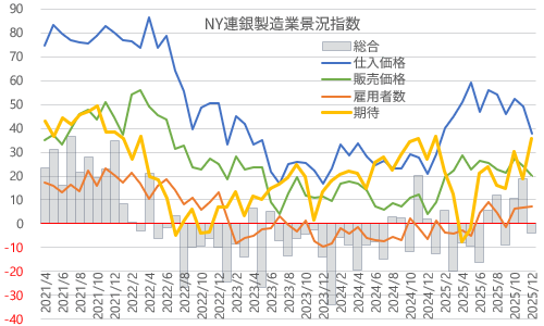 12月のNY連銀製造業景況指数は-3.9。市場予想の10.0を大幅に下回り、前月比-22.6の急低下で3ヵ月ぶりのマイナス圏。