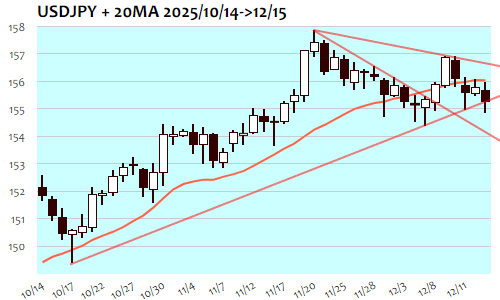 ドル円は-61銭、0.39%の反落で12月4日(155.12)以来、10日ぶりの安値。東京朝に156円回復トライに失敗して戻り売り、株安局面にも連れて155円半ばへと急反落、いったんは下げ渋るも午後には155円近辺までの一段安。155円割れでは下げ渋り、欧州・NY午前の時間帯までは155円10銭を挟んでの保ち合い推移。NY市場では154円80銭台で下げ渋り、午後には米10年債利回り上昇にも連れて155円30銭台まで反発。しかし155円半ばの節目を割り込んだ状態となり、短期下値目安153円半ばを目指す流れが進行しやすい状況に。雇用統計がそのトリガとなる可能性も。逆に156円超へと切り返すようなら流れは反転、158円台を目標に反発トライへと向かう流れとなる可能性も。