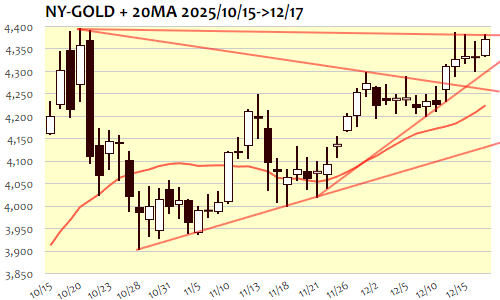 17日のNY金は+41.6ドル、0.96%の大幅反発。終値では10月20日(4359.4)を上回って2ヵ月ぶり、今年50回めの最高値更新。アジア時間序盤の4330ドル付近が安値となってこの日も上値トライ、前日高値を超えて4370ドル台まで上昇もロンドン序盤には4350ドル割れへ。4日連続で上ヒゲを残して失速か、という展開から4340ドル台で下げ渋り、米長期金利低下とドル安局面となったNY朝に反発。高値では一時4380ドル台まで上昇し、NY引け後も4370ドル近辺を維持。4250ドルの節目突破に伴う短期上値目標4350ドル近辺には3日連続上ヒゲで到達後に終値でもしっかりクリア。ただし最高値圏4390ドル台には少し届かず。目先、4350ドル近辺でサポ-トされるようなら一段高トライへと向かう可能性も。