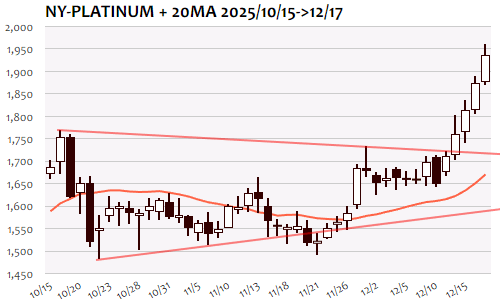 プラチナ価格は+417円、4.18%高で5日続伸。4日連続で今年12回めの最高値更新。5日続伸は2ヵ月ぶりで今年5回め。上昇率は今年の絶対値平均騰落率1.49%の2.8倍、今年8番目の急騰。12月の絶対値平均は187円、2.01%。最近の平均的な値幅で予想される目先の水準は10200円近辺から10600円近辺。