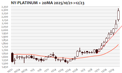 NYプラチナは+198.0ドル、9.48%高で9日続伸。2008年3月以来17年9ヵ月ぶりの高値。上昇率では2020年3月24日(+74.2ドル、11.82%)以来、5年9ヵ月ぶりの急騰。9日続伸は2019年7月以来、6年5ヵ月ぶり。アジア時間の2120ドル台が安値となり、2200ドル超えでは一服、NY朝には株高基調に連れて2250ドル台へ、NY午後には反発局面のNY金にも追随する形で2280ドル台へと一段高。NY引け後には2300ドルの大台超えで最高値も更新。12月の絶対値平均騰落値幅は48.5ドル、目先の予想変動範囲は2250ドルから2400ドル。