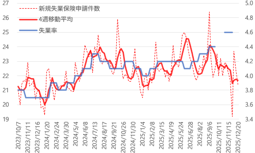 ただ、2025年夏までは新規失業保険申請件数の4週移動平均と連動し、上下動を繰り返しながらも悪化、しかし秋以降は失業率が一段と悪化した可能性を示唆したのに対し、失業保険申請件数は減少方向へ、改善方向へと逆行。