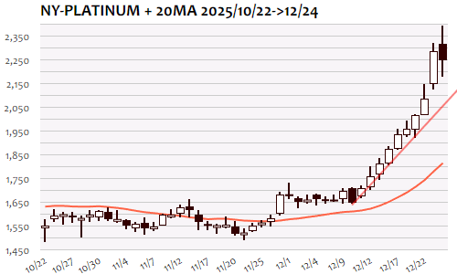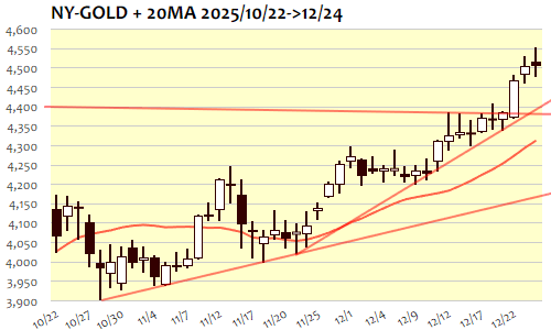 24日のNY金は-2.9ドル、0.06%の小幅安で4日ぶりの反落。終値ベースでは4日ぶりの最高値更新ストップ。アジア時間には4510ドル台から一段高トライ、前日の最高値4530ドルを超えると4550ドル台まで上昇。最高値更新後に失速すると4510ドル台を中心に小幅保ち合い状態に、短縮取引のNY市場では一時4480ドル割れの安値をつけ、4500ドルの大台を回復したところでクリスマス休暇入り。十字線を形成し、上値トライ一服の可能性を残して年末へ。いったん調整となれば10月末安値(3901.3)から最高値(4555.1)の38.2%戻し(4305.3)から半値戻し(4228.2)辺りがサポ-ト候補に。