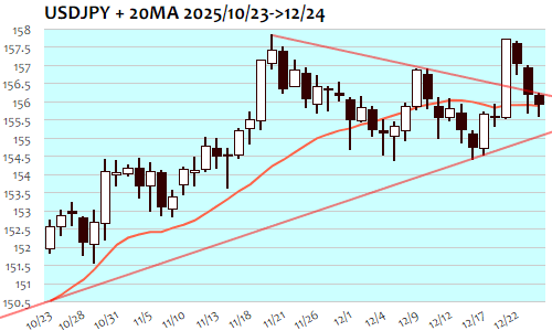 ドル円は-29銭、0.19%安で3日続落。12月18日(155.56)以来、1週間ぶりの安値。東京朝のドル安局面では156円20銭台から155円50銭台まで急落、この日の高値と安値を付けた後は自律反発も156円超えで失速、レンジを縮小する形で保ち合い推移。閑散状態のNY市場では155円90銭近辺へと収束。20日移動平均線(155.89)にもサポートされ、3日続落でも3日前の大陽線の範囲を維持して下げ渋る格好にも。155円半ばまでの水準を維持できれば底堅い展開がもう少し続く可能性も。154円70銭の節目を割り込むようだと調整局面形成へと向かう可能性、152円近辺までが短期下値目安に。