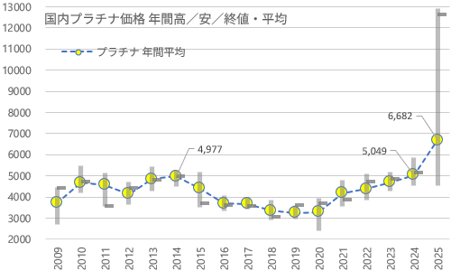 2025年末の国内プラチナ価格は前年末から+7493円、145.1%の上昇。7年連続の上昇、上昇率では2009年(72.3%)を上回って近年最大。