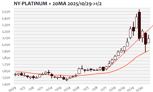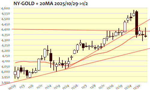 2026年初日、1月2日のNY金は前年末から-11.5ドル、0.26%の続落。12月12日(4328.3)以来、3週間ぶりの安値。時間外は4340ドルからスタートして急反発、ロンドン序盤には4400ドルの大台回復トライ、高値では4410ドル台まで上昇して失速。NY市場では米10年債利回り上昇に連れる形で4340ドル割れへと急反落、安値では4320ドル近辺まで下落してNY引け後には4340ドル近辺へと反発。上ヒゲを残して反発トライに失敗する形となり、4340ドルの節目を維持できないようなら一段安トライへの可能性。短期下値目安は10月末安値(3901.3)から最高値(4584.0)の半値戻し(4242.7)、4250ドル近辺まで。4390ドル超へと切り返すことができれば4470ドル程度までを目安に反発トライの可能性も。