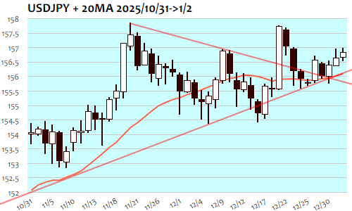 ドル円は+18銭、0.11%の小幅高で3日続伸。12月22日(157.02)以来、10日ぶりの高値。東京午前の時間帯に156円50銭台の安値をつけ、午後には157円手前まで反発。157円ラインに上値を押さえられる形となった欧州時間は156円80銭近辺までの小幅レンジで保ち合いに、NY市場では一時156円50銭台までの安値再トライ後に156円後半へ。閑散状態の2026年初日は上下わずか48銭ほどの小動きに。流れとしては156円60銭の節目突破に伴う短期上値目標158円を目指す流れがゆっくりと進行も、157円が目先の攻防ラインに。