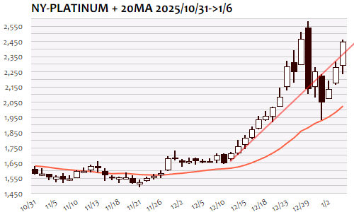 NYプラチナは+167.2ドル、7.32%の大幅高で3日続伸。終値ベースで最高値となった12月26日(2471.4)以来、10日ぶりの高値。アジア時間に2230ドル台の安値をつけて切り返すと2340ドル台へと急騰。ロンドン・NY朝にかけての一服を経てNY市場では株高・金高の流れに追随する形で2400ドルの大台超えへと急騰、高値では2460ドル台まで上昇。2260ドルの節目突破に伴う短期上値目標2370ドル近辺到達後も勢いは衰えずに一段高。2400ドルの大台維持なら最高値更新への早期トライも。