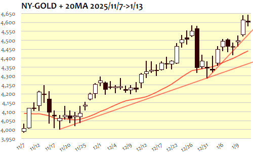 NY金:4,599.1 ドル 1/13(火) ▼15.6(0.34%)