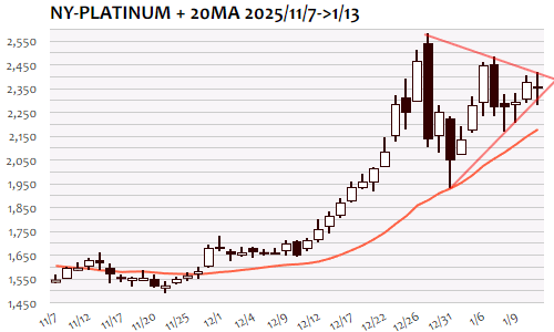 プラチナ価格は+45円、0.34%の続伸。1週間前の1月7日最高値(13307)に向けてじわりと接近。12360円から13310円までの広めの保ち合いレンジ半ばから上限方向へと向かう流れにはやや失速感も。保ち合い長期化懸念とともにブレイク後の大幅変動への警戒感も高まる状況にも。目先、上抜けなら13500円超へと一段高トライ、下抜けなら12100円近辺までを目安に調整へ。