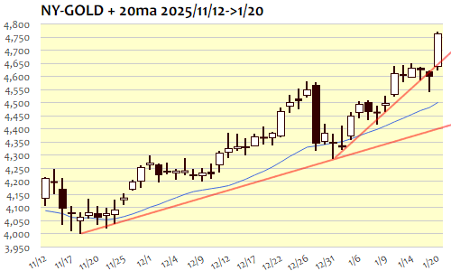 20日のNY金は連休前から+170.4ドル、3.71%の大幅高となって3営業日ぶりの反発。3営業日ぶりで今年3回めの最高値更新。グリーンランドを巡る米欧対立懸念から週明け時間外に4700ドル付近まで急騰後は4680ドル近辺での小康状態に。祝日を挟んでのアジア時間から安全資産買い圧力再燃、ドル安、株安、債券安(金利上昇)の米国売りに押し上げられる格好となってロンドン序盤には4720ドル台、NY市場では4760ドル台へと一段高。4640ドルの節目超えに伴う短期上値目標4700ドルの大台トライに成功後も勢いは止まらず、NY引け後も一段高トライの様相に。次の大台4800ドルが早くも意識されそうな状況に。当面の下値サポ-トは4590ドル、割れると4500ドル近辺までの調整も。