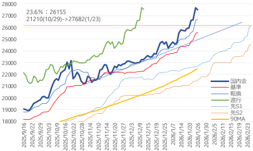 26日の国内金価格は先週末から-166円、0.60%安で6営業日ぶりの反落。6営業日ぶりの最高値更新ストップ。円高による高値トライ一服も、先週5日間の合計上昇値幅1973円の12分の1ほどの小幅調整。もう一段の調整進行なら5日の今年安値(24244)から23日最高値(27682)の23.6%戻し(26871)近辺も。さらに調整が続けば9日移動平均線(26393)から38.2%戻し(26369)辺りも。27690円超へと切り返す展開となれば27800円トライへ。