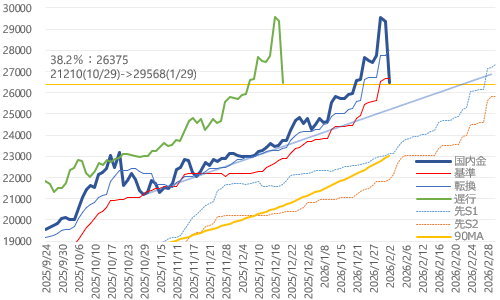一目均衡表では転換線(28017)、基準線(26657)をまとめて下抜けて一役逆転。短中期的には10月末安値(21210)から最高値(29568)の38.2%戻し(26375)付近に到達。この近辺でサポートされないようだと半値戻し(25389)も意識され、10月末以降の上昇ペースから逸脱して急騰した分を巻き戻して従来のサポートライン付近で落ち着く可能性も。