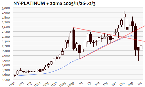 NYプラチナ:2,208.8 ドル 2/3(火) ▲104.7(4.98%)