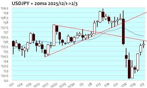 ドル円は+14銭、0.09%の小幅高で3日続伸。1月22日(158.42)以来、10日ぶりの高値。前日までの反発局面一服となった東京時間には155円60銭台から30銭台へと揉み合いながらも軟調気味に推移。30銭近辺の安値で下げ渋った欧州時間には反発局面再開、155円後半へと水準を切り上げるとNY市場では一時156円台へと高値トライ。失速後はイランのドローンを米軍が撃墜との報道などもあり、NY午後には一時155円50銭台まで急反落。しかし米議会では予算合意で政府機関一部閉鎖が終了、これを好感して下げ渋る展開となって155円80銭近辺へ。ただし前日高値圏で今年高値(159.45)から今年安値(152.10)の半値戻し(155.78)近辺で上げ渋る展開に。レジスタンスとなりつつあるこの水準を突破できれば61.8%戻し(156.64)トライへ。