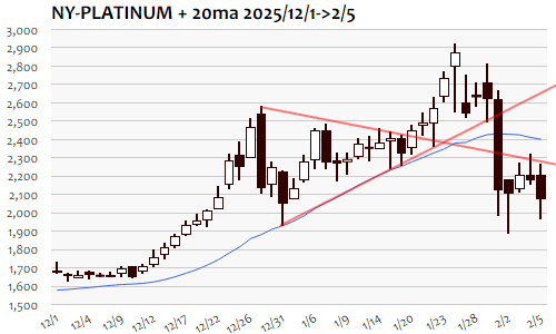NYプラチナ:2,070.6 ドル 2/5(木) ▼106.1(4.87%)